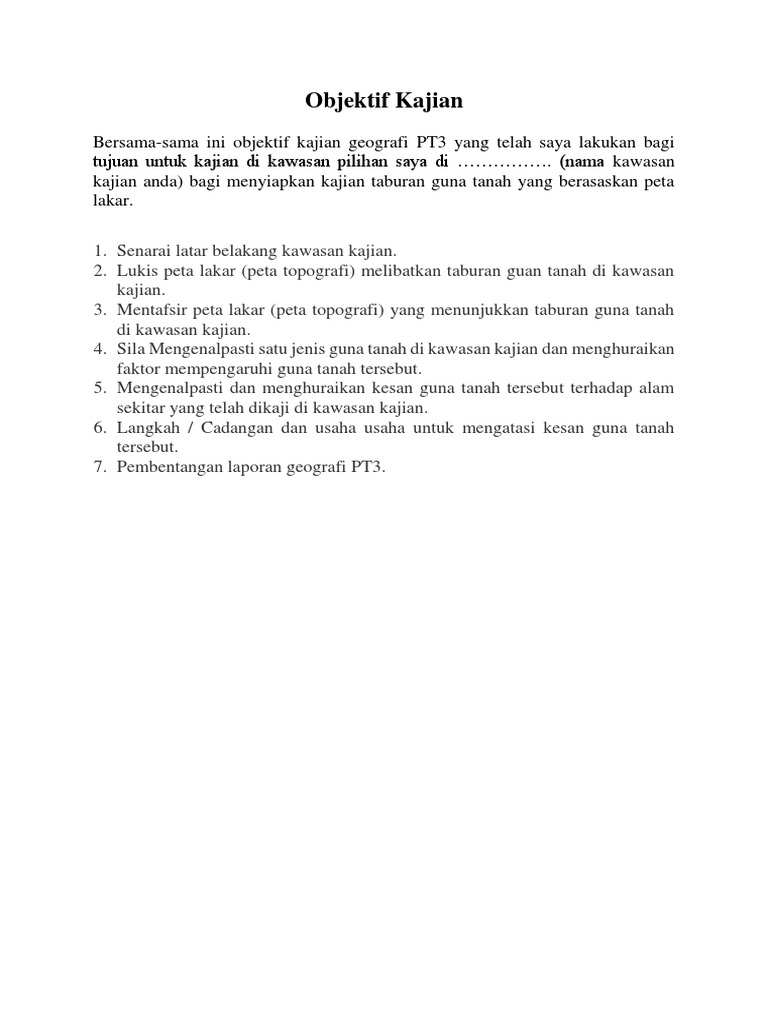 Objektif Kajian Geografi Pt3 - Contoh Kaedah Kajian Geografi Pt3 Terbaik Preschool Printables Cute Stickers Printables - Menyenaraikan dan menghuraikan tentang punca pencemaran alam sekitar di kawasan kajian.. Pelajar perlu menghuraikan setiap kaedah kajian yang diguna pakai secara terperinci dalam mendapatkan maklumat untuk tugasan iaitu. Format penulisan kerja kursus geografi pt3. Saya dapat melukis peta lakar taburan guna tanah di …………………… (kawasan kajian). Halangan untuk memajukan kawasan berlorek: Calon pelajar peperiksaan tingkatan 3 kali tugasan geografi pt3 ini telah pun diminta untuk membuat.