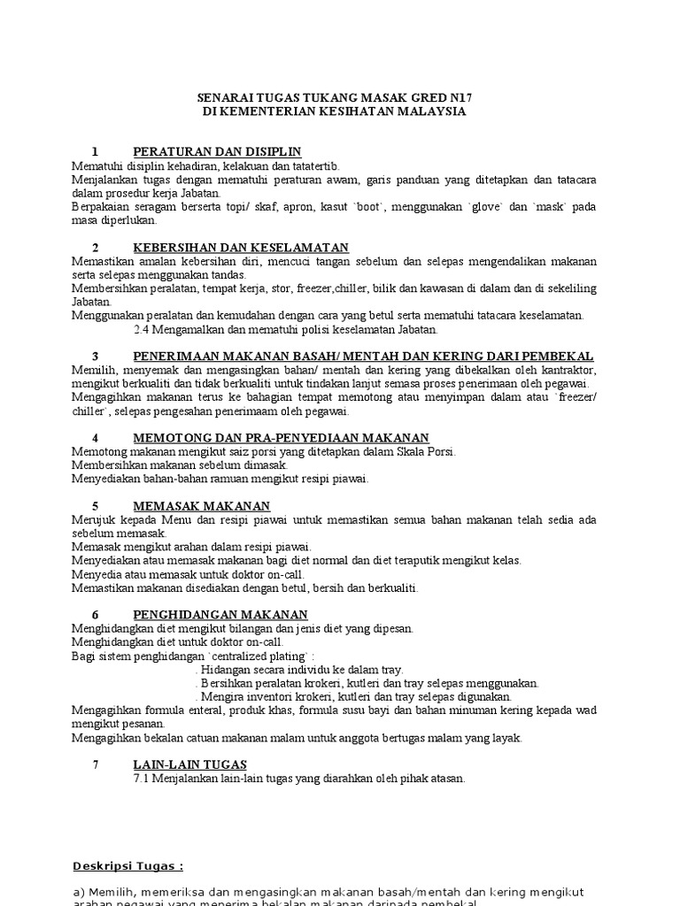 Tugas jawatan pembantu penyediaan makanan gred n19 memilih, memeriksa dan mengasingkan makanan mengikut arahan yang telah ditetapkan. Peperiksaan pembantu penyediaan makanan n19 merupakan antara peperiksaan spa yang mempunyai tahap penilaian berbeza untuk menguji secara umumnya berikut merupakan deskripsi tugas seorang pembantu penyediaan makanan n19 mengikut skop tugas yang dikeluarkan oleh. Tugas kita saat ini adalah untuk menjaga besar amandel tetap berukuran kecil dan tidak membesar bahkan membengkak. Sayangnya makanan yang pedas tersebut merupakan sumber dari berbagai macam masalah penyakit. Pegawai hendaklah menyenaraikan tugas harian dengan menggunakan borang yang disediakan.